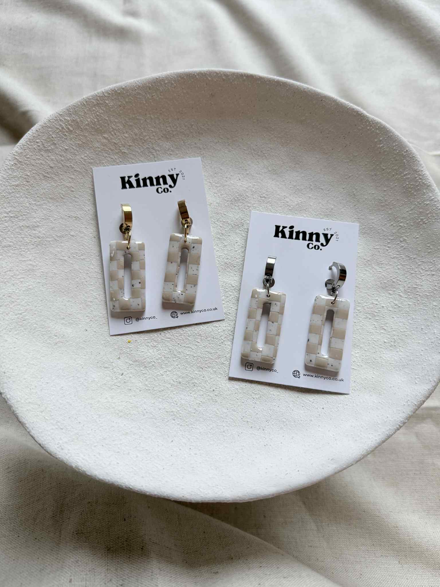 Introducing the Chai Bowie Earrings in a fresh new colourway. This update to our bestselling Bowie style showcases a sophisticated checkerboard beige pattern combined with subtle speckled accents. Crafted for those who appreciate understated elegance, these earrings offer a versatile accessory that complements both casual and formal looks with expert craftsmanship and timeless design.