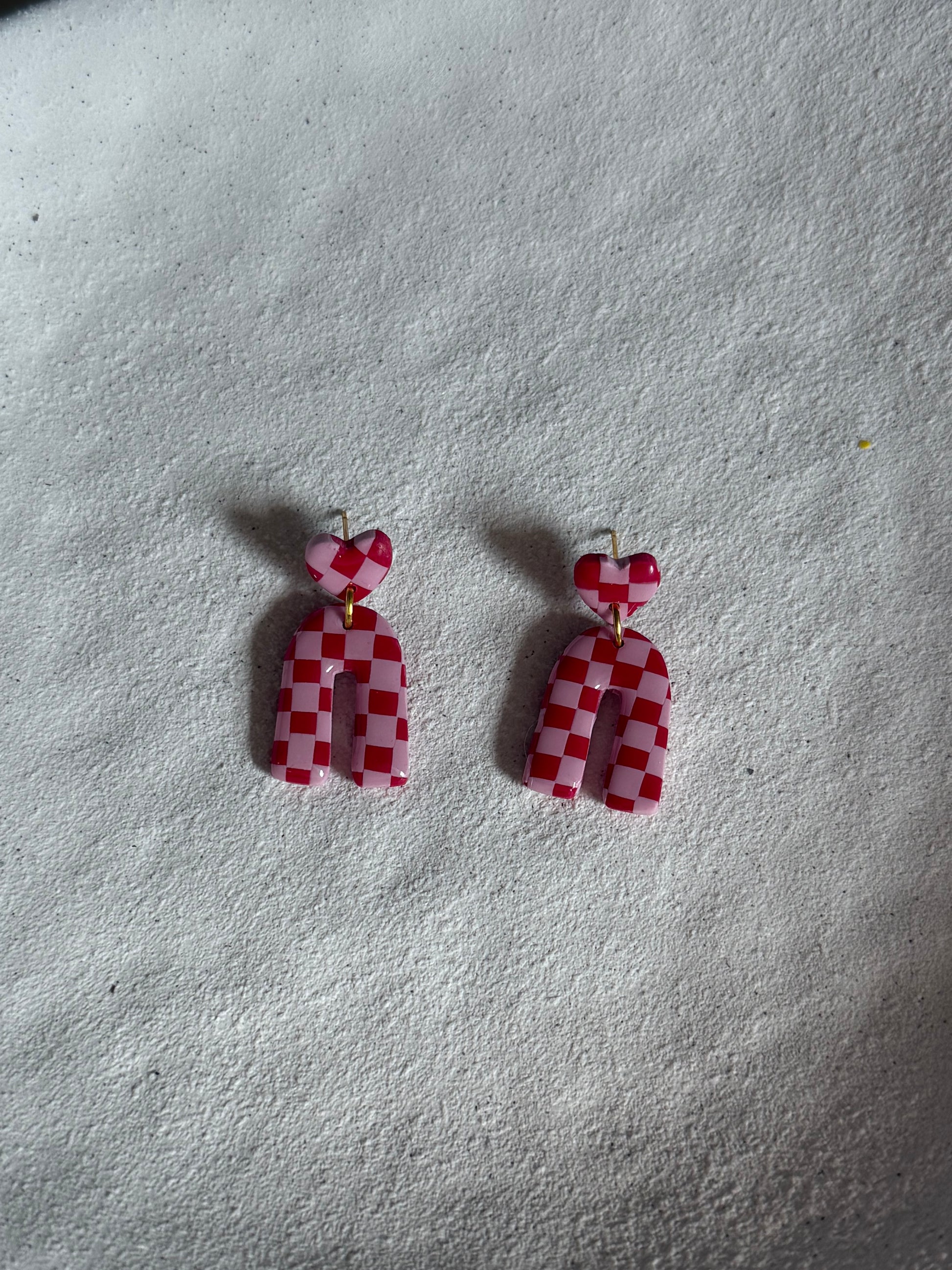 Add a touch of love to your outfit with our Devotion collection. These checkerboard earrings feature a stunning combination of pink and red, with a heart stud and unique arch design. Perfect for the month of love and beyond.