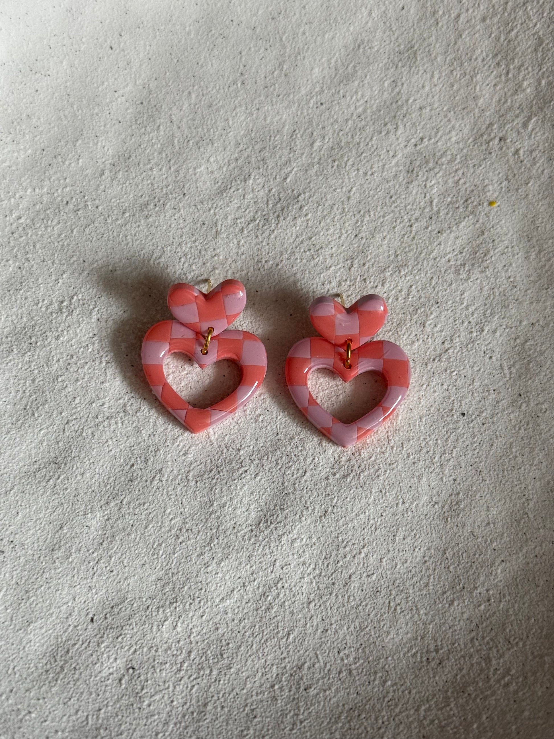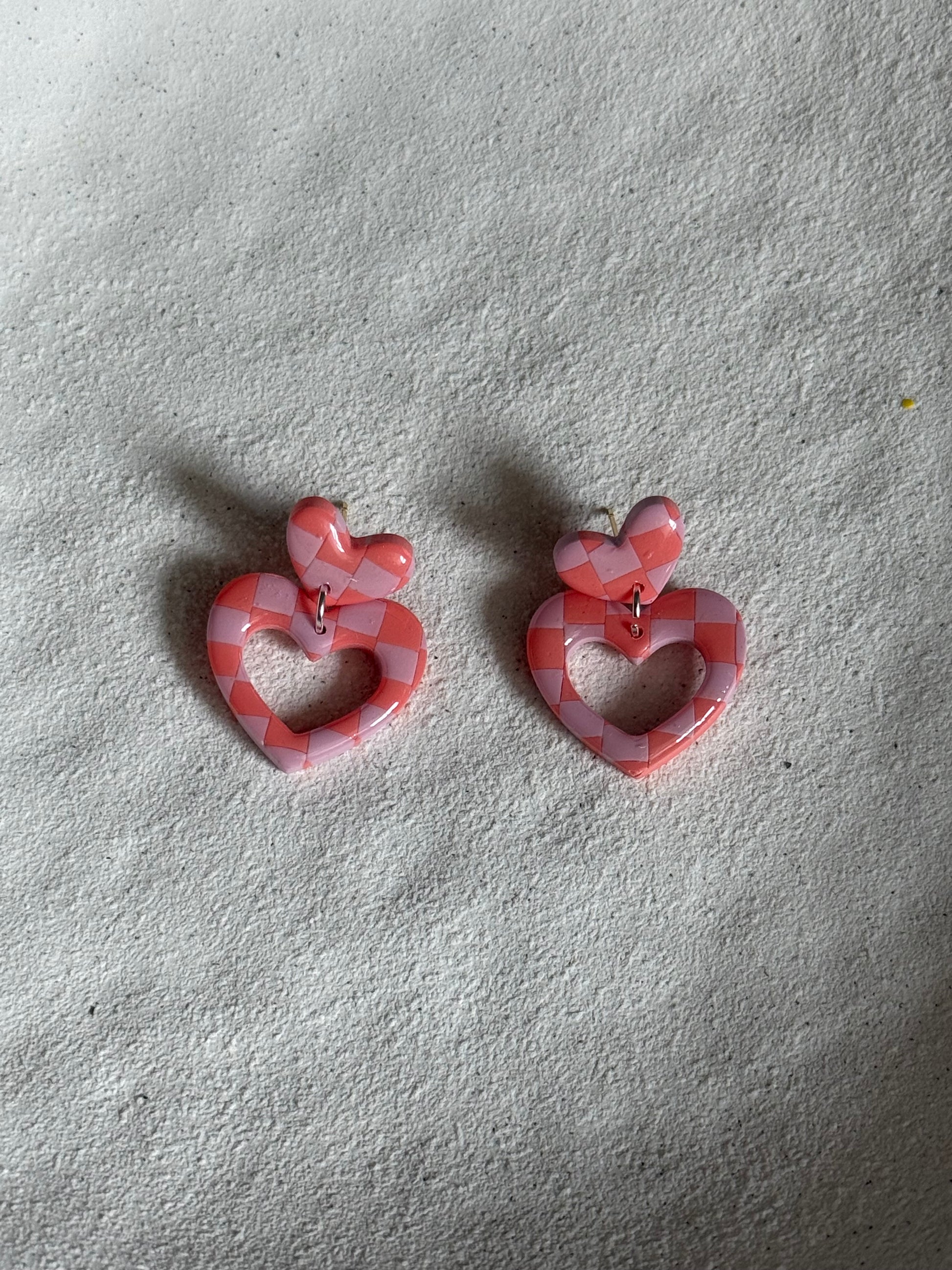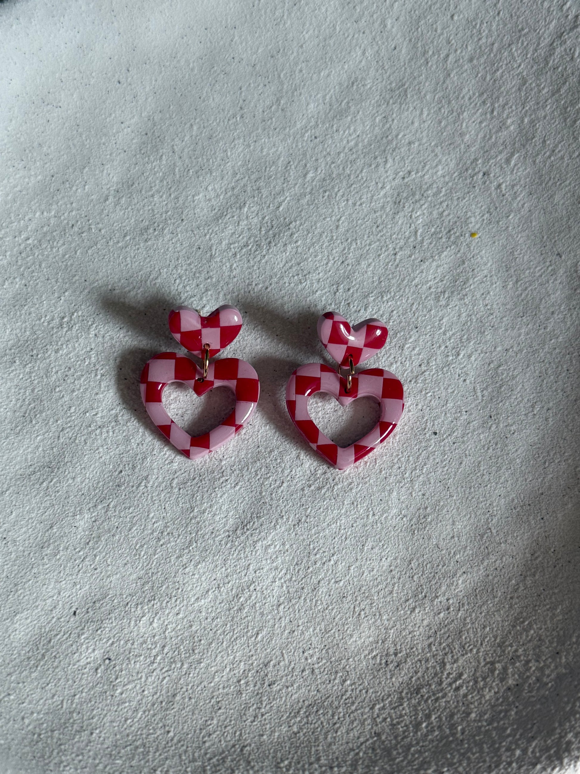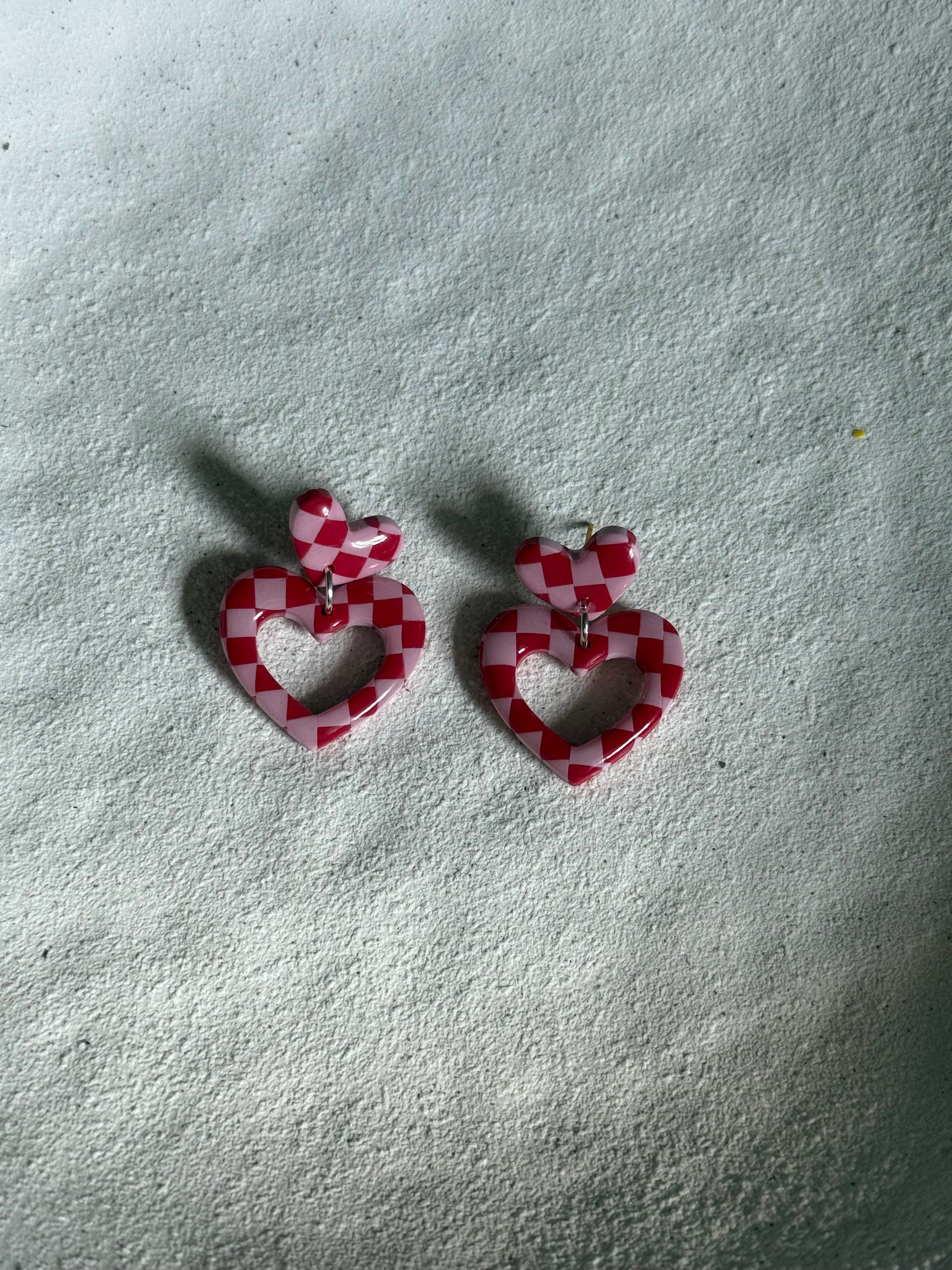 Introducing Chappell, the perfect accessory for the month of love! These checkerboard heart earrings in pink and red are a must-have for adding a touch of romance to any outfit. Experience the love with Chappell.